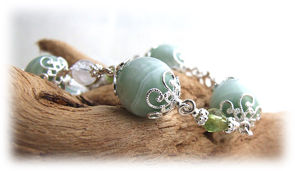 マーブル調の優しい色合いのグリーンアラゴナイトに 光り輝くペリドット