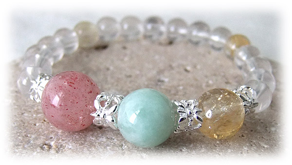 どれが 本当の自分の声なんだろう・・・ どうして 繰り返し行ってきたパターンを変化させることができないのだろう・・・ マイナスなスパイラルに はまりやすい人程 感受性が強く 感じなくていいことまで 感じてしまいます。 許してる自分がいて どこかで許せていない自分。 笑ってるけど 心の中は 晴れやかでない自分。 相反する気持ちを感じたときに 嫌悪感を持ち自分自身すら否定してしまいます。 どの感情も自分自身のもの・・・ その意識の使い方を知っていくこれから・・・ 色々な自分がいるから 人の気持ちが理解できる。 その長所を押さえ込まず 自然体で過ごしながら 魂が望む生き方へと導かれてほしい・・・ そんな想いを込めて紡いだブレスレットです。 大らかな気持ちで前進することをサポートしてくれる石達は あなたの願望を汲み取りながら 大切なものと出会うための これからの展開を運び あなたの持っているものを最大限に活かし 進めるように崇高なエネルギー 優しいエネルギーを あなたに注ぎ込んでくれるでしょう。 ただ そのままで過ごしてください。 心が心地よい温度で動き出したら 必然的な変化も多く まっさらなスタートをきれる朝が待っています。 ゆっくり・・・でいい。自分のペースでいい。 小さな幸せを見逃さないように 生きたいと望む人と共鳴するブレスレットです。 あなたの毎日が 優しい愛に触れられる日々でありますように・・・ 望みをかけたことに 良い成果という答えを受け取ることができますように・・・