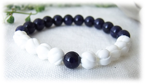 このブレスレットには 深い藍色の美しいビーズとカットが個性的なシェルを使って紡ぎました。