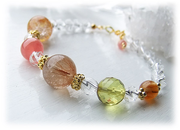 オレンジルチルクォーツ 12mm オレンジガーデンルチルクォーツ 12mm インカローズ 9.5mm グリーンアンバー 10mm ルチルインベリル 7mm クリスタル 6mm Silver925 K24ゴールドメッキ (ニッケルフリー) 引き輪・アジャスター2cm インカローズ4mmチャーム付 手首サイズ(内径) 16.8cm
