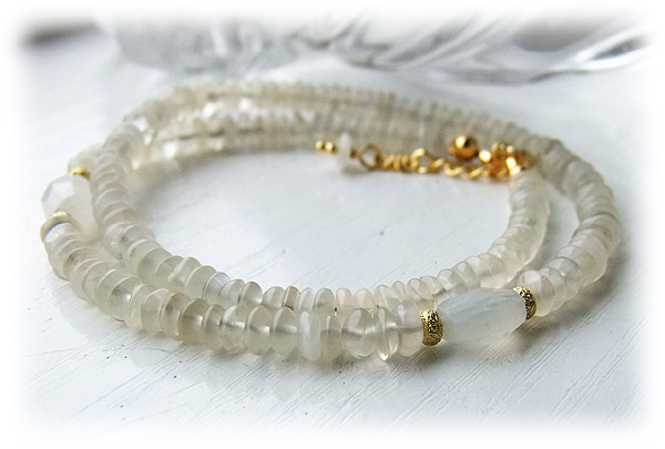 カットが美しいムーンストーンのビーズを2つアクセントに ベースには小さなボタン型をたっぷり使って