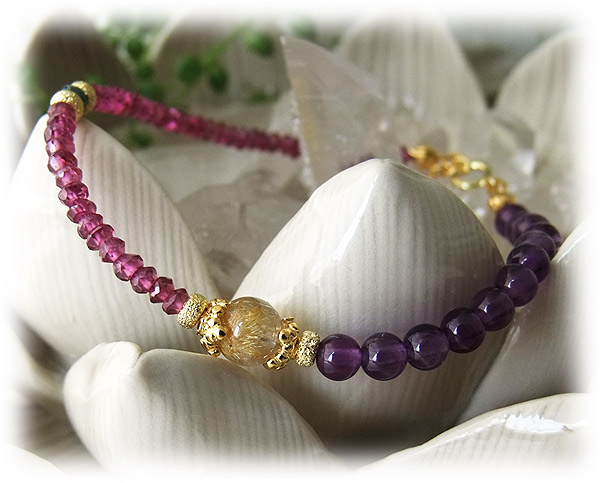 美しいロードライトガーネットとアメジストの艶やかなビーズ ゴールドのルチルクォーツ